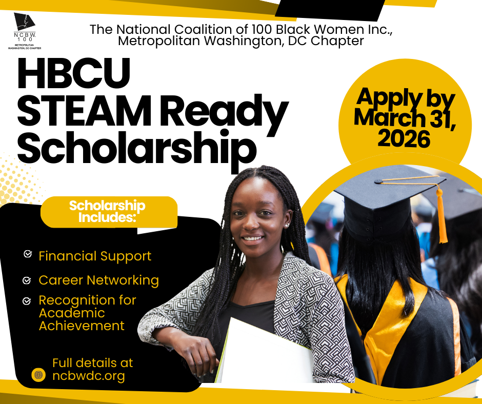 Our HBCU STEAM-Ready Scholarship aims to improve the lives of young Black women in Washington, DC through the promotion of science, technology, engineering, mathematics, and the arts. Recipients majoring in the STEAM field will be awarded scholarship funds to support their education at an HBCU institution. Please see the application criteria listed below before completing the application. Completed application due by 11:59 pm (EST) Tuesday, March 31, 2026. No applications will be accepted after the deadline.